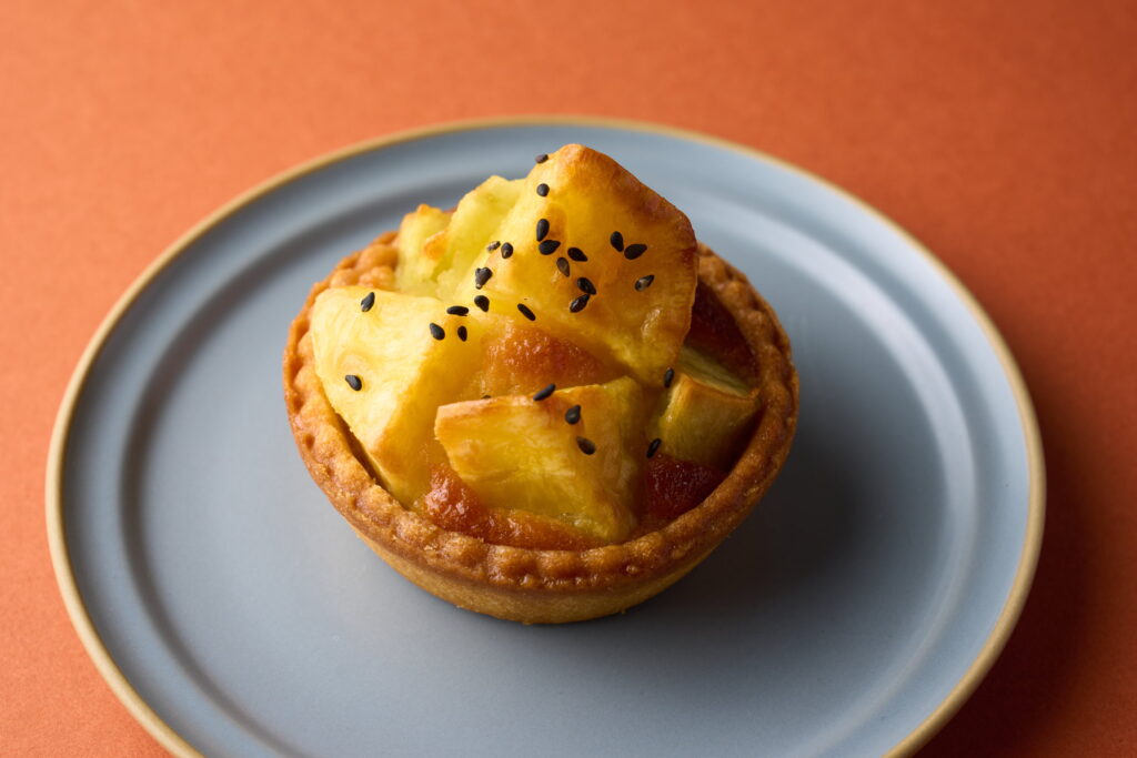 サクサクのタルト生地に、ほくほくとした黄金千貫をのせて焼き上げました。素材の甘みをそのまま楽しめる一品で、お土産にも適しています。