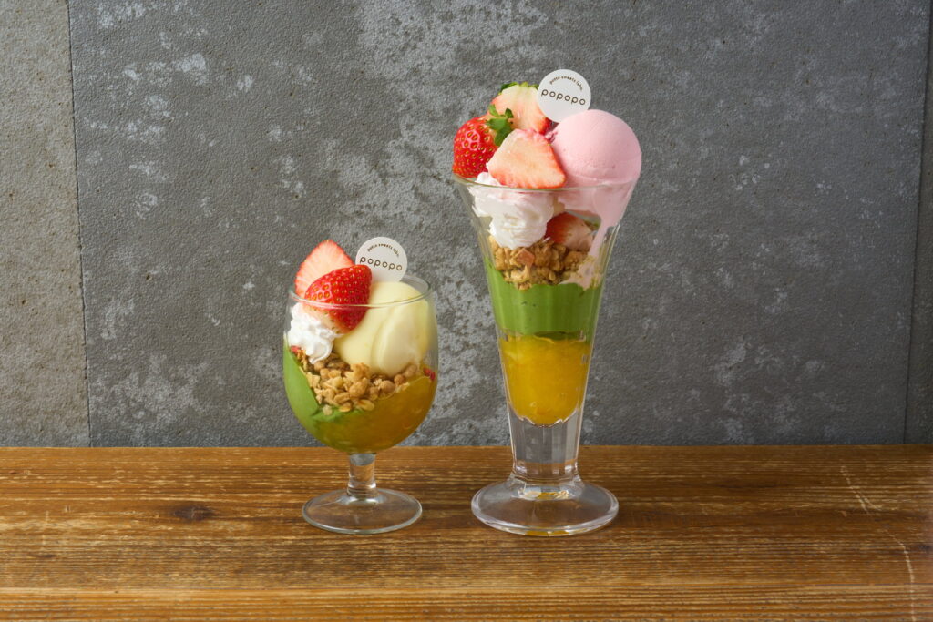 とろける濃厚抹茶ムースと季節の苺、さっぱり檸檬と苺の滑らかジェラート、食感グラノーラで“層”を楽しむ贅沢パフェ。