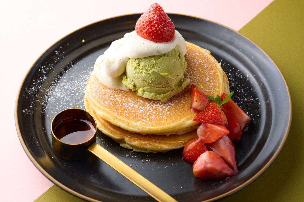 いちご、ふわ生クリーム、ピスタチオアイスを重ねた“層”のご褒美。メープルで仕上げる王道リッチパンケーキ。